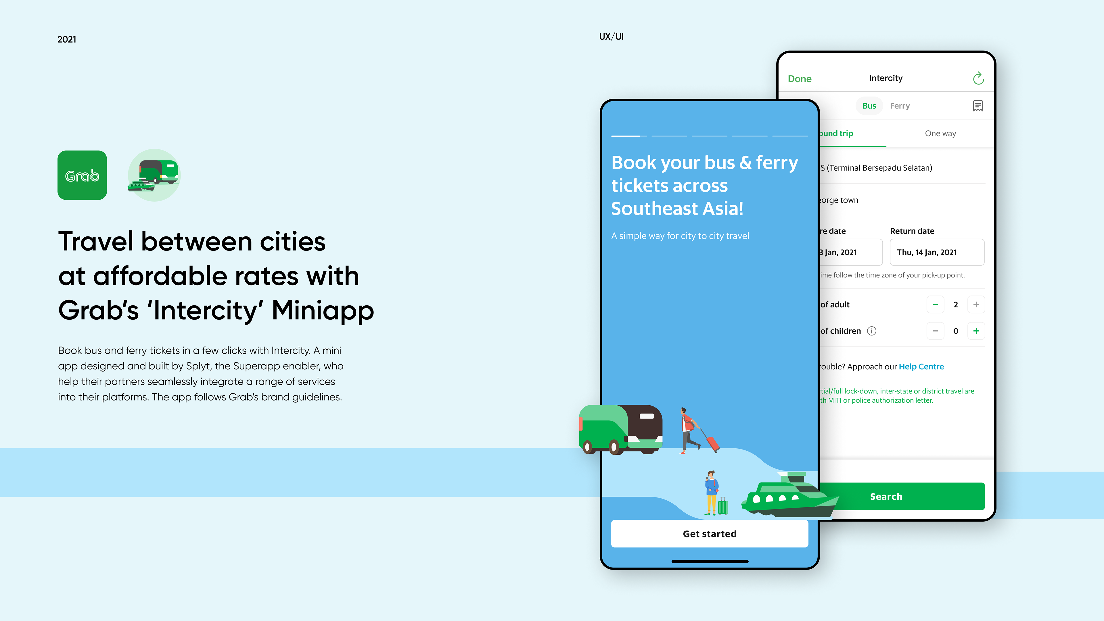 User experience, user interface, and illustrations for Grab's Intercity - a mini app that allows users to nook bus and ferry tickets in just a few clicks within Grab's ecosystem.